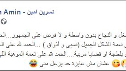 وتابعت نسرين أمين: "الحمد لله على نعمة القبول.. الحمد لله على نعمة الشكل الجميل (نسبي وأذواق) ...الحمد لله على السمعة الطيبة والتاريخ النضيف الخالي من أى بلطجة أو قضايا مريبة.. الحمد لله على نعمة الموهبة اللي الجمهور بس هو اللى يحكم عليها عشان مش عايزة حد يزعل مني".