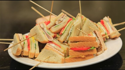 طريقة أخرى مبتكرة لتقديم الساندوشات، بوضعها في أسياخ الشيش طاووق مع مكعبات الجبن والطماطم وقطع خبز التوست.