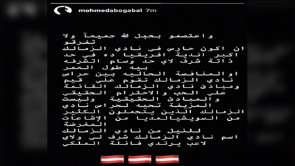 وأضاف:"مينفعش أكون نايم عندي تمرين بدرى و يجيلى 3000 تليفون من النادي.. إنت نزلت ستورى على زميلى و اخويا ابو جبل ... أنا بجد مش عارف أقول ايه بس موضوع السوشيال ميديا بقى مقرف أوي".