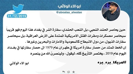 وقال الولائي، في تغريدات عبر حسابه على "تويتر" إنه "حين يحاصر الحشد الشعبي، بل الشعب الحشدي، سفارة الشر في بغداد هذا اليوم فهو قريبا سيحاصر معسكرات ومقرات القتل الأمريكية الممتدة على الأرض العراقية. بل سيحاصر سفارات الذيول، من دول الانبطاح كالسعودية والإمارات والبحرين وغيرها"، وإن "الخط الممتد من حصار سفارة أمريكا في طهران عام 1979 إلى حصار سفارتها في بغداد اليوم عام 2019، يختصر التاريخ كله".