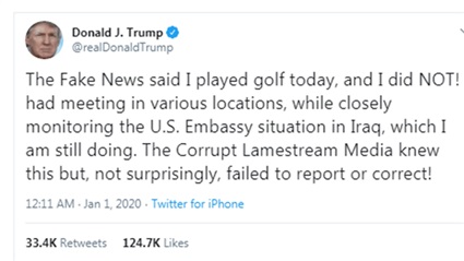 وقال "ترامب" في تغريدة على "تويتر": "الأخبار المزيفة تقول إنني لعبت الغولف اليوم، أنا لم أفعل هذا الأمر، كنت أجري لقاءات في أماكن مختلفة، للتركيز على الأوضاع التي تتعرض لها سفارة الولايات المتحدة في العراق".