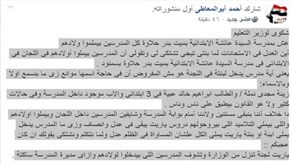 تقدم أولياء أمور مدرسة السيدة عائشة الابتدائية بميت بدر حلاوة سمنود بمحافظة الغربية، استغاثة لوزير التعليم بإيقاف الغش داخل لجان الامتحانات حيث يقوم المعلمون بحل الأسئلة لابنائهم فقط أو الطلاب الذين يأخذون دروسا خصوصية لديهم مما أثار غضب أولياء الأمور، وقام أحدهم بنشر الشكوى على صفحة "أمهات مصر" بمواقع التواصل الاجتماعى مطالبين بمنع حالات الغش الفردية داخل المدرسة.