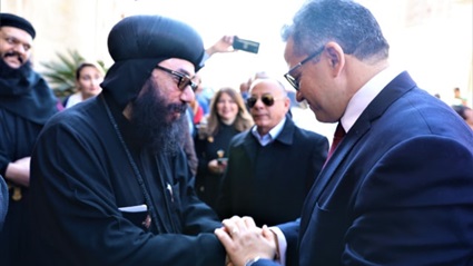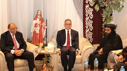 وكان في استقبالهم نيافة الأنبا يوليوس النائب البابوي وأسقف عام كنائس حي مصر القديمة والمنيل وفم الخليج وعدد من الأساقفة، وقدم الوزراء التهنئة إلى الأنبا يوليوس وكافة الأخوة الأقباط بمناسبة عيد الميلاد المجيد والسنة الميلادية الجديدة.
