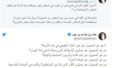 رئيس وزراء قطر السابق طرح عدة أسئلة في تغريداته حول المسؤول عن "هدر المال الخليجي" في هذه الأزمة، و"تفرقة الأسر" و"شتم القادة والرموز السياسية والدينية"، كما اتهم الدول الأربع بالتخطيط لهذه الأزمة منذ سنوات، متسائلا عن الأدلة التي قيل إنها ستقدم ضد بلده.
