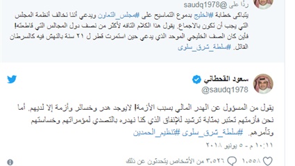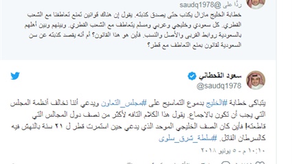 وأضاف القحطاني، في سلسلة تغريدات نشرها عبر حسابه الرسمي على "تويتر"، قائلا إن "بن جاسم يتباكى بدموع التماسيح على مجلس التعاون ويدعي أننا نخالف أنظمة المجلس التي يجب أن تكون بالاجماع." وأضاف: "أين كان الصف الخليجي الموحد الذي يدعي حين استمرت قطر لـ٢١ سنة بالنهش فيه كالسرطان القاتل؟".