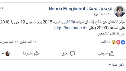 موعد إعلان نتائج شهادة البكالوريا 2018 ونسب النجاح أصبح محل بحث كبير خلال الساعات الماضية بعدما أعلنت أمس وزيرة التربية الوطنية الجزائية ‏Nouria Benghabrit حيث نشرت الوزيرة على صفحتها الرسمية على موقع التواصل الاجتماعي فيس بوك عن إجابة السؤال الذي شغل بال طلاب الباكلوريا وهو " متى تظهر نتائج البكالوريا" فقد حددت الوزيرة موعد نتائج شهادة البكالوريا، حيث صرحت بالتالي: " سيتم الإعلان عن نتائج إمتحان شهادة # البكالوريا دورة 2018 يوم الخميس 19 جويلية 2018 على الساعة (20:00) على http://bac.onec.dz